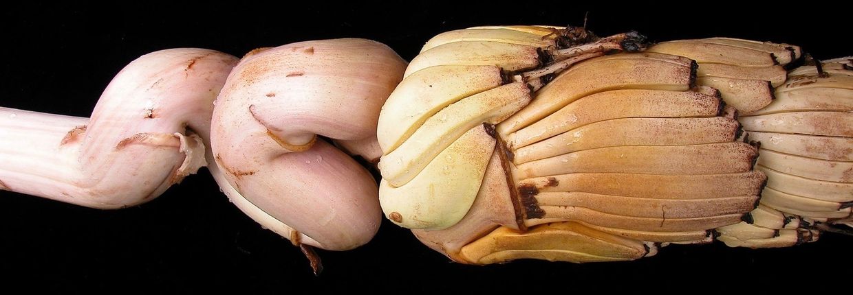 Mai‘a hāpai is a variety of banana, in Hawai'ian meaning “pregnant banana,” which bears fruit out of the top of the stem. Sometimes the developing bunch is not able to push out into the open and the fruit forms within the stem. Harvesting the bananas then requires a kind of operation, to access the bunch stalk coiled to fit within the stem.